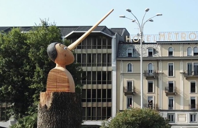 Pinocchio nasce dal legno, emerge dalla natura selvaggia di un tronco e assume la propria forma. Grezzo e perfetto. Pinocchio guarda al cielo. Pinocchio e il naso delle bugie. Poi un cuore trafitto da una freccia e la scritta FOREVER. La menzogna dell’amore, o forse (ci piace pensare, per addolcirci un poco la vita) l’illusione del medesimo. L’ultima fatica di Mr Save The Wall è spuntata questa mattina in piazza Cavour a Como. Ancora una volta l’artista propone un lavoro multistrato. Come sempre esplosivo e bello a una prima occhiata e poi più impegnativo, aggregato e carico di segni a una seconda o una terza. Il gioco di Mr Save The Wall è sempre stato questo: illudere con la facilità apparente per poi complicare – in progressione – il pensiero di chi osserva. Così vien da immaginare che lo spunto d’artista vada oltre l’amore e rifletta sul passare del tempo e delle cose, su verità inossidabili che cedono al passare degli anni, non per malafede ma perché, ogni tanto, le intenzioni e le volontà sono superate dal caso, dai fatti. Il tronco è ancestrale, è vita. E Pinocchio guarda in alto, un po’ triste, un po’ indifferente, come a dire: tutto passa, è solo la vita. Ma il tronco è sempre piantato a terra e le radici sembrano tenere, per fortuna.