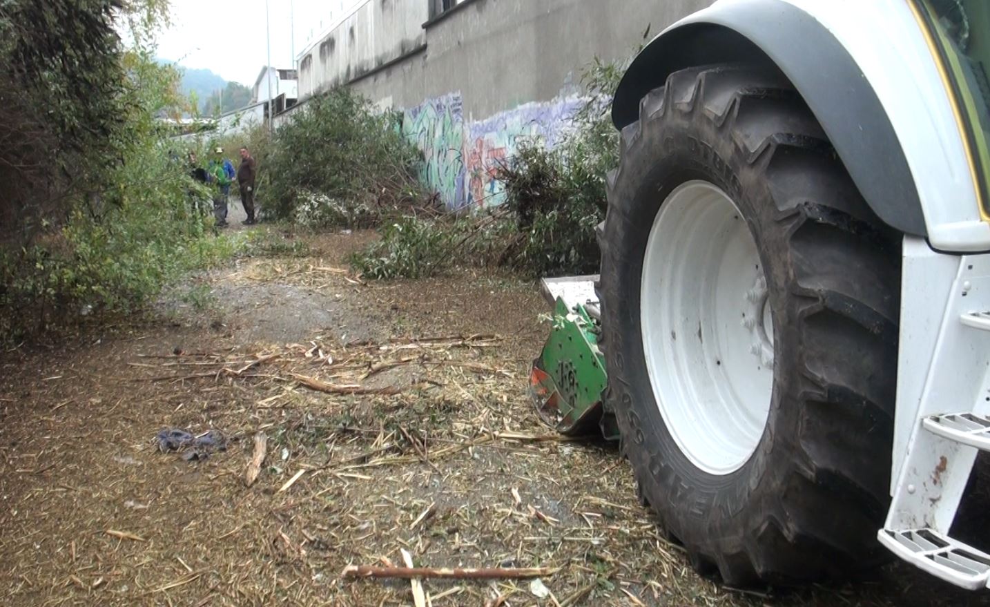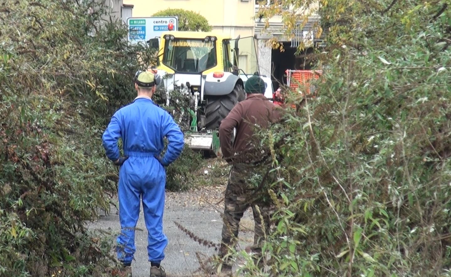 Area Ticosa di Como: sono iniziate stamattina le operazioni di disboscamento e di pulizia. Gli addetti della ditta incaricata hanno messo in moto un trattore equipaggiato con un trituratore, che sminuzza e trasforma in trucioli rami arbusti e sterpaglie.