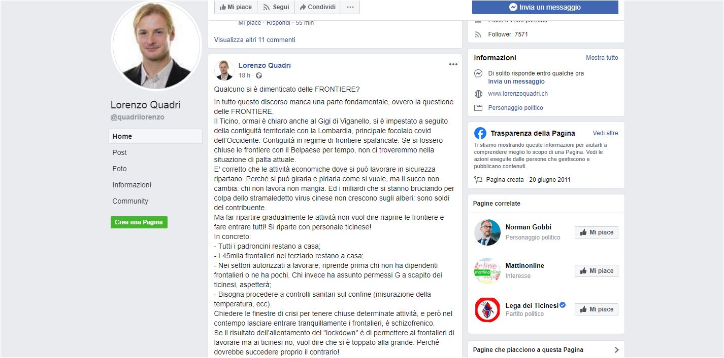 Il Ticino “si è impestato a seguito della contiguità territoriale con la Lombardia principale focolaio covid dell’Occidente”, “I 45mila frontalieri nel terziario restano a casa”, e ancora “Cancellare la libera circolazione delle persone, che è uguale alla libera circolazione dei virus!. Lorenzo Quadri, rappresentante della Lega dei Ticinesi, in un lungo messaggio sulla sua pagina Facebook, si scaglia contro i frontalieri.