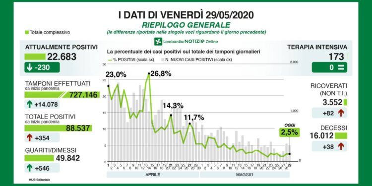 Nelle ultime 24 ore sono stati processati 14.078 tamponi e sono stati accertati 354 nuovi casi, per un totale di 88.537 cittadini lombardi che sicuramente hanno contratto il virus. Il bollettino del contagio in regione registra oggi un aumento di 82 malati ricoverati nei reparti ordinari per un totale di 3.552, mentre restano 173 i degenti in terapia intensiva.