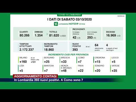 I dati suddivisi per province: a Como sono 7 i nuovi casi. E’ sempre Milano a registrare i numeri più alti con 160 in più (di cui 101 a Milano città), preoccupano Monza Brianza (con 48), Varese (con 35) e Brescia (con 33), segue Bergamo con 25. Oggi nessun territorio è a contagio 0.