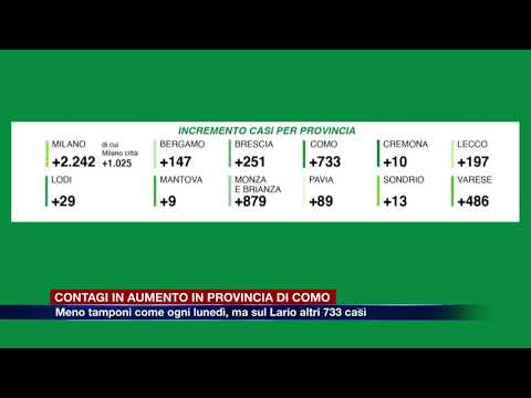 Il numero più alto di contagi si registra in provincia di Milano, 2.242, di cui 1.025 nel capoluogo lombardo. Segue Monza e Brianza con 879 contagi e subito dopo omo, che ha appunto altri 733 positivi accertati. A Varese i nuovi tamponi positivi sono 486. La provincia di Brescia ha registrato altri 251 contagi, mentre sono 197 a Lecco e 147 a Bergamo. A fronte del numero minore di tamponi complessivamente processati, sono cinque le città con meno di 100 nuovi casi: Pavia 89, Lodi 29, Sondrio 13, Cremona 10 e Mantova 9.