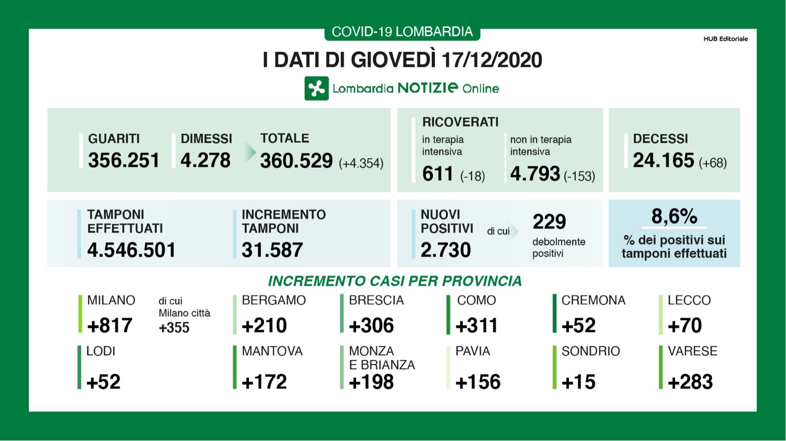 A fronte di 31.587 tamponi effettuati sono 2.730 i nuovi casi. Il rapporto tra positivi e test effettuati raggiunge l’8,6% (ieri era al 7,9%). I guariti/dimessi sono 4.354.
