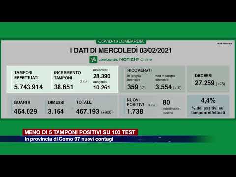 Il bollettino quotidiano del contagio in Lombardia si basa oggi su un totale di 38.651 tamponi processati – di cui 28.390 molecolari e 10.261 antigenici – con un dato di 1.738 nuovi positivi, pari al 4,4%. I guariti e dimessi sono 906, mentre in regione si contano altri 46 lombardi che hanno perso la vita per il Covid.