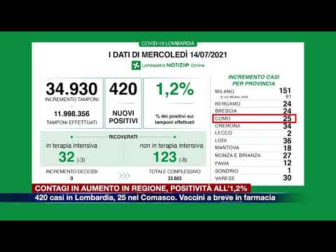 Crescono ancora i contagi Covid in Lombardia e passano dai 241 di ieri ai 420 di oggi a fronte di 34.930 tamponi effettuati e nel Comasco salgono da 15 a 25 in 24 ore. Il tasso di positività è in risalita ed è all’1,2%. I numeri diffusi nel bollettino odierno non sono incoraggianti, ma non mancano due note positive: la diminuzione dei ricoverati (in calo di tre nelle terapie intensive, dove restano 32 persone e di otto negli altri reparti dove in totale rimangono 123 pazienti) e non sono stati registrati decessi.