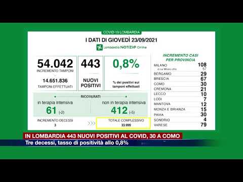 A fronte di 54.042 tamponi effettuati in Lombardia, sono 443 i nuovi positivi al Covid, pari allo 0,8%. L’aggiornamento quotidiano sul contagio diffuso dalla Regione, registra 3 decessi nelle ultime 24 ore, salgono a 33.999 le vittime del virus dall’inizio della pandemia. Nelle strutture ospedaliere calano di due i pazienti ricoverati in terapia intensiva, che oggi sono 61, mentre sono 412 (5 in meno) i malati in reparto. Scorrendo i nuovi positivi divisi per provincia, a Milano sono 108 -di cui 57 in città-, Varese: 79. Brescia: 67; Como e Pavia: 30; Bergamo: 29; Cremona: 21; Monza e Brianza: 15; Mantova: 12; Lecco: 10; Lodi: 7; ed infine 4 a Sondrio.