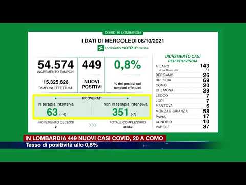 L’aggiornamento sul contagio diffuso dalla Regione Lombardia, registra 449 nuovi casi di coronavirus, 54.574 i tamponi effettuati, il tasso di positività è pari allo 0,8%