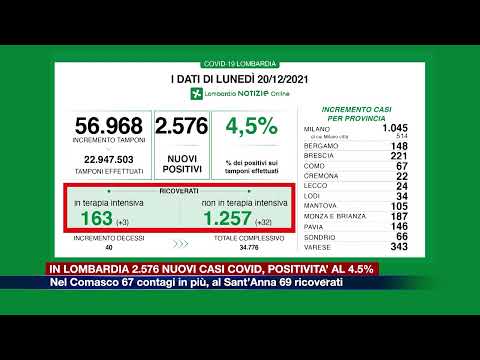 A fronte di 56.968 tamponi effettuati, sono 2.576 i nuovi casi Covid in Lombardia (il tasso di positività 4,5%).