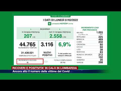 Ricoveri e positività in calo. Continuano a diminuire i pazienti in ospedale in Lombardia: secondo l’ultimo aggiornamento sul contagio diffuso dalla Regione, i ricoverati nelle terapie intensive sono 6 in meno, 207 in totale, mentre nei reparti con un calo di 24 pazienti sono complessivamente 2.558. In discesa anche il tasso di positività: a fronte di 44.765 tamponi effettuati, sono 3.116 i nuovi casi pari al 6,9%, ieri il tasso era al 7,8%. Ricoveri e positività frenano, ma resta invece sempre alto il numero dei decessi: 70 nelle ultime 24 ore le vittime del Covid.