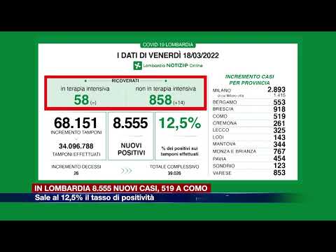 Ricoveri stabili nelle terapie intensive in Lombardia. A fronte di 68.151 tamponi effettuati, sono 8.555 i nuovi positivi al Covid in Lombardia, 519 nel Comasco.