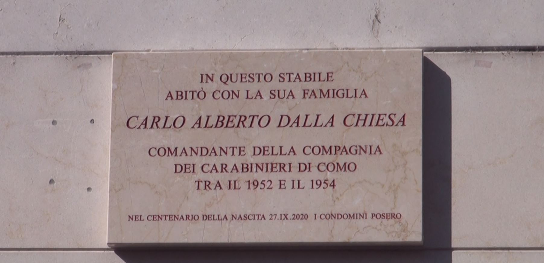 In quel periodo infatti è stato comandante della Compagnia Carabinieri di Como. La targa – voluta dai condomini dello stabile – reca la scritta “In questo stabile abitò con la sua famiglia Carlo Alberto Dalla Chiesa, comandante della compagnia dei carabinieri di Como, tra il 1952-54”.