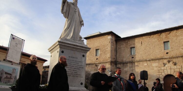 (ANSA) – NORCIA (PERUGIA), 30 OTT – Un momento di preghiera in piazza San Benedetto a Norcia ha ricordato la forte scossa di terremoto che sette anni fa sconvolse la città e il centro Italia. Davanti alla facciata della Basilica, liberata dalle impalcature, si sono ritrovati i monaci benedettini, l’amministrazione comunale e alcuni cittadini, con don Marco Rufini che ha guidato la preghiera. Rispetto agli anni precedenti, quest’anno la novità è la celebrazione della santa messa che alle 11.30 si svolgerà all’interno della Basilica. Ricostruite le mura esterne, la "casa" di San Benedetto sarà completata nel 2025. Entro la fine di quest’anno saranno invece portati a termine gli interventi sul campanile e sul portico delle misure. (ANSA).