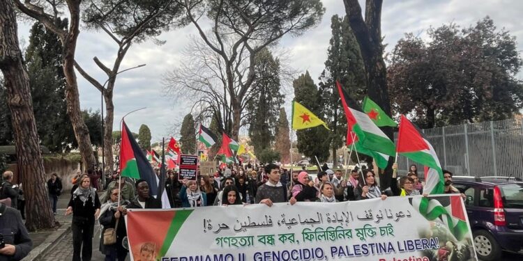 (ANSA) – ROMA, 16 MAR – La foto del presidente Israeliano Benjamin Netanyahu e della premier Giorgia Meloni che si stringono le mani, sporche di sangue, e la scritta ‘stop genocidio’ è il manifesto issato sul camion che ha aperto il corteo dei manifestanti pro Palestina a Roma partito al grido di "Palestina libera, intifada fino alla vittoria". Sulle note della canzone ‘Casa mia’ di Ghali, i manifestanti hanno attraversato la Capitale. In prima fila con la figlia per la liberazione di Gaza e della Palestina, anche l’ attrice Yamina Brirmi, l’artista di origine tunisine alla ribalta negli ultimi mesi per la sua interpretazione di Giulia Luciani, nella serie Suburra Eterna. Molti gli slogan contro Israele e il governo italiano: "Uccidono le donne uccidono i bambini, Israele stato di assassini". E ancora: "Contro il governo che ci ha reso un paese di guerra". "L’arma più potente di Isra-Hell è il tuo silenzio", si legge in uno dei manifesti. Il corteo, sulle note di ‘Bella Ciao’ e poi al grido "Palestina libera, intifada", è arrivato sotto al ministero dell’Istruzione "contro la repressione del governo, contro i manganelli". "Israele sionista, stato terrorista. Fuori i sionisti dalla Palestina", alcuni degli slogan dei manifestanti. "Quelli che sta uccidendo l’istruzione pubblica sono gli stessi che stanno facendo la guerra", hanno urlato gli studenti in piazza. "A Valditara dovremmo mettere le orecchie da asino. Siete fascisti", hanno ripetuto gli attivisti dal megafono. (ANSA).