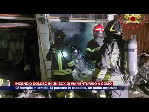 L’incendio nel box, il fumo che invade due dei quattro piani della palazzina, 95 famiglie in strada, 18 persone soccorse (tra cui 4 bambini e un anziano allettato), 13 sono state portate in ospedale per accertamenti. E un uomo arrestato per aver appiccato il rogo. E’ stata una notte di paura a Como in via Venturino nel quartiere di Breccia. L’allarme è scattato intorno all’una e mezza per le fiamme all’interno di un garage condominiale. I residenti nel cuore della notte sono stati svegliati dal fumo che ha invaso buona parte del condominio. In pochi istanti le sirene delle quattro squadre dei vigili del fuoco, delle ambulanze (10 in tutto quelle arrivate assieme a due automediche) e della polizia hanno rotto il silenzio del quartiere. In via precauzionale le abitazioni sono state evacuate. Momenti di apprensione si sono vissuti per un pensionato allettato con l’appartamento completamente invaso dal fumo. Complesse le operazioni di messa in sicurezza vista la quantità di persone e di spazi coinvolti. I pompieri hanno lavorato fino alle 5 del mattino. Parallelamente il lavoro delle volanti della polizia ha permesso di risalire ad un 41enne di origini marocchine, in regola in Italia, accusato di aver appiccato il rogo. Ancora da chiarire il possibile movente. Sono in corso ulteriori accertamenti sulle condizioni psichiche dell’uomo portato in carcere al Bassone per incendio doloso aggravato.