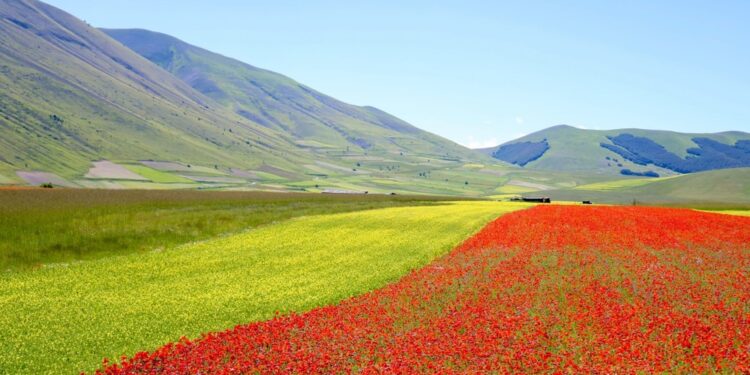 (ANSA) – NORCIA (PERUGIA), 17 GIU – Il Pian grande è una tavolozza di colori dove a dominare è il rosso dei papaveri e il giallo della senape selvatica, ma si stanno affacciando anche il bianco delle margherite, il blu dei fiordalisi e il celestino della lenticchia. A Castelluccio di Norcia, nel cuore dei monti Sibillini, si rinnova la fioritura, uno spettacolo naturalistico tra i più apprezzati in Italia. "Quest’anno è una fioritura davvero molto bella" sottolinea con l’ANSA Gianni Coccia, agricoltore e anima di Castelluccio. "Le condizioni climatiche – aggiunge – hanno permesso di seminare la lenticchia in un arco temporale ampio, a cominciare da fine febbraio e quindi in anticipo rispetto agli altri anni e ciò ha permesso tutta questa esplosione di colori già a metà giugno. Colori che giorno dopo giorno mutano e si potranno ammirare fino ai primi di luglio, e anche più in là se non farà particolarmente caldo". Intanto centinaia hanno raggiunto Castelluccio. "Anche in virtù dei limiti di accesso ad auto e camper di domenica, suggerisco di venire ad ammirare e fotografare la fioritura durante la settimana, quando c’è sicuramente meno confusione e si può godere al meglio dello spettacolo", è l’appello di Coccia. Nei fine settimana, in particolare nelle prossime domeniche, chi vorrà salire sul Pian Grande lo dovrà fare con delle apposite navette che partiranno da Norcia e dai versanti marchigiani che conducono a Castelluccio. (ANSA).