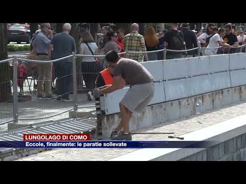 Paratie del lungolago di Como sollevate per una settimana. Intervento dei tecnici dell’impresa che sta effettuando i lavori questa mattina sul lungolago cittadino per alzare le paratie da piazza Sant’Agostino fino alla sede della nuova biglietteria a lago, vicino a piazza Cavour. Questa l’immagine che si avrà in caso di esondazione del lago, quando verranno alzate le paratie.