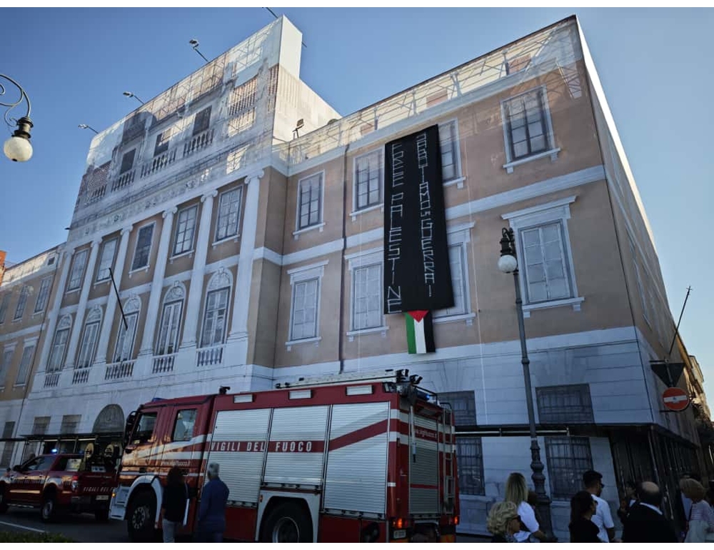 (ANSA) – TRIESTE, 12 OTT – Un grande striscione di colore nero con la bandiera della Palestina e la scritta "Free Palestine. Sabotiamo la guerra" è comparso questa mattina sulla facciata dello storico Palazzo Carciotti, in centro lungo le Rive. L’edificio è in ristrutturazione e sulla facciata è stata installato un grande telone che ne riproduce il disegno. (ANSA).