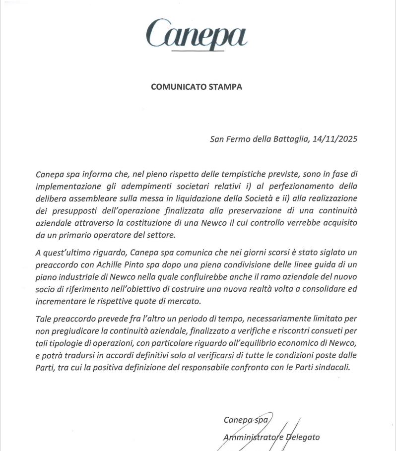 “Canepa spa – si legge nel documento – comunica che nei giorni scorsi è stato siglato un preaccordo con Achille Pinto spa dopo una piena condivisione delle linee guida di un piano industriale di Newco nella quale confluirebbe anche il ramo aziendale del nuovo socio di riferimento nell’obiettivo di costruire una nuova realtà volta a consolidare ed incrementare le rispettive quote di mercato. Tale preaccordo – si legge ancora – prevede fra l’altro un periodo di tempo, necessariamente limitato per non pregiudicare la continuità aziendale, finalizzato a verifiche e riscontri consueti per tali tipologie di operazioni, con particolare riguardo all’equilibrio economico di Newco, e potrà tradursi in accordi definitivi solo al verificarsi di tutte le condizioni poste dalle parti, tra cui la positiva definizione del responsabile confronto con le parti sindacali”.
