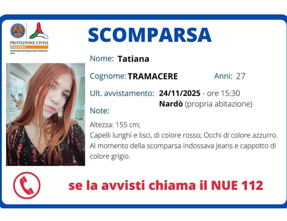(ANSA) – NARDÒ, 02 DIC – Continuano senza sosta e senza alcun esito, anche oltre i confini regionali, le ricerche di Tatiana Tramacere, la ragazza che vive a Nardò, in provincia di Lecce, e di cui non si hanno più notizie da lunedì 24 novembre. A quanto si apprende, il telefono della giovane risulta spento. Al momento gli investigatori stanno lavorando su più piste, ascoltando anche amici e parenti della 27enne, e analizzando ogni dettaglio che sta emergendo da queste testimonianze. Resta sempre viva l’ipotesi di un allontanamento volontario di Tatiana Tramacere, che lavora nel mondo digitale occupandosi di pubblicità. Le sue pagine social sono molto seguite, con migliaia di followers: anche questi elementi sono al centro dell’attività dei carabinieri. "Tatiana non si allontana mai senza avvisare la famiglia. Per questo – scrive il sindaco di Nardò Pippi Mellone sulla propria pagina social – la preoccupazione cresce di ora in ora. Le ricerche continuano senza sosta. La Prefettura e le forze dell’ordine stanno controllando tutto il territorio. Se l’avete vista o avete informazioni chiamate subito il 112. Anche un piccolo dettaglio può fare la differenza". (ANSA).
