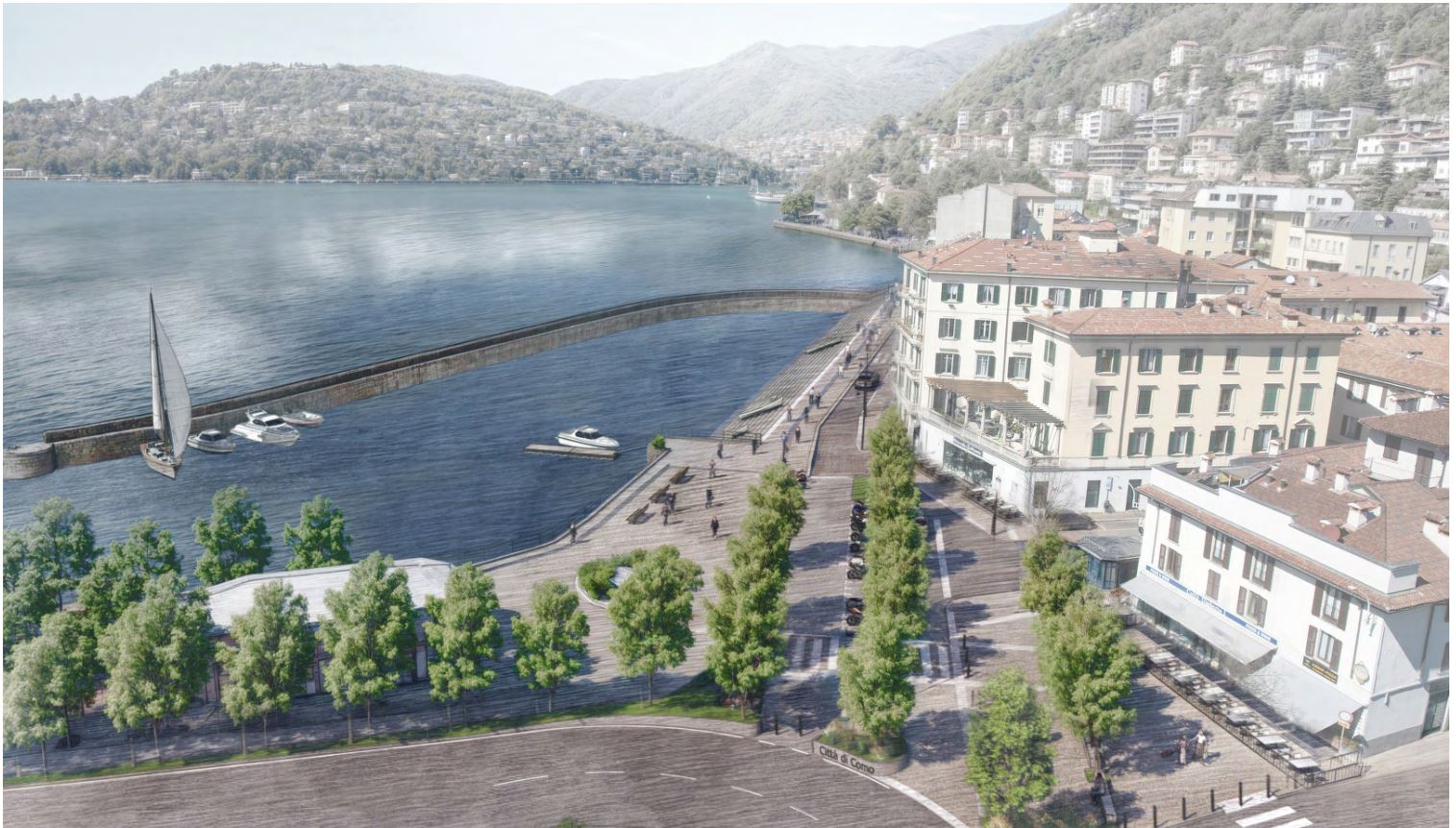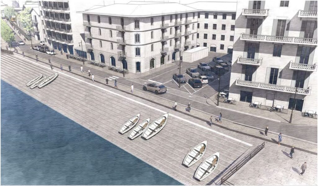 La pavimentazione in pietra sarà in continuità, verranno definiti percorsi di transito carraio nella misura strettamente necessaria a garantire il passaggio e gli accessi alle proprietà private, più spazio pedonale nella parte a lago e mentre l’area in concessione alle attività commerciali a ridosso degli edifici sarà ridotta e delimitata da parapetti o recinzioni. In piazza De Gasperi in particolare sarà realizzata una sorta di pensilina per l’attesa fuori dalla funicolare, cambiano poi sedute e arredi urbani in linea con quanto già realizzato nel tratto di lungolago tra piazza Matteotti e piazza Cavour. Saranno, inoltre, più accessibili aiuole e zone a prato e l’imbocco del tratto sarà contrassegnato da un viale alberato. Si metterà ordine, infine, ai posti moto. Per quanto riguarda l’illuminazione si parla di nuovi sistemi volti a integrare e valorizzare il contesto ambientale di pregio, il punto di partenza è la realizzazione ex novo di tutte le parti strutturali e impiantistiche fino ai punti luce.