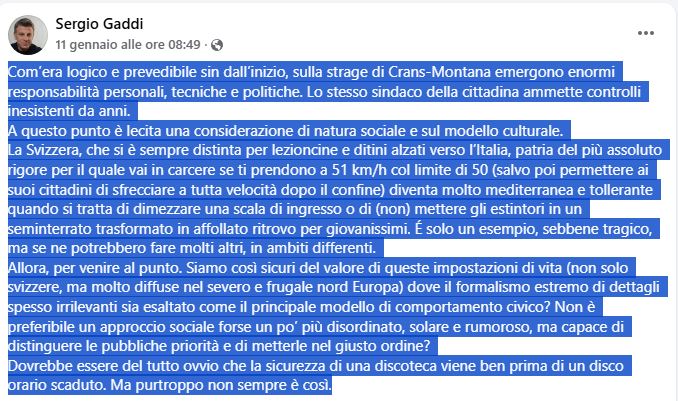 La strage di Crans-Montana e in particolare il tema dei controlli e della sicurezza all’interno del locale diventa terreno di scontro tra Italia e Svizzera. Sui social, oltre a molti cittadini comuni, anche la politica non si tira indietro nel dibattito. E il botta e risposta viaggia sul confine. A intervenire per primo nelle scorse ore era stato il consigliere regionale di Forza Italia, Sergio Gaddi al quale, a stretto giro, ha replicato Lorenzo Quadri, consigliere nazionale della Lega dei Ticinesi.