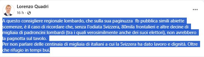 A poca distanza, a prendere le difese della Svizzera pensa Quadri. “A questo consigliere regionale lombardo, che sulla sua paginuzza fb pubblica simili abiette scemenze, è il caso di ricordare che, senza l’odiata Svizzera, 80mila frontalieri e altre decine di migliaia di padroncini lombardi (tra i quali verosimilmente anche dei suoi elettori), non avrebbero la pagnotta sul tavolo. Per non parlare – sottolinea infine – delle centinaia di migliaia di italiani a cui la Svizzera ha dato lavoro e dignità. Oltre che rifugio in tempi bui”.