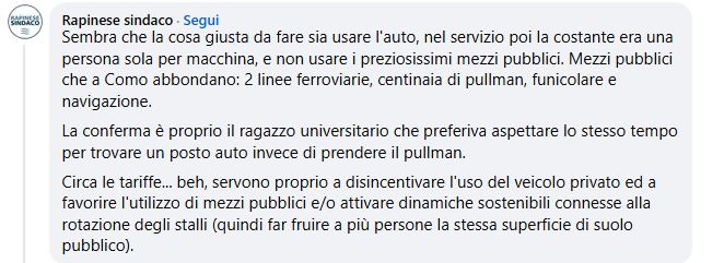 “Sembra che la cosa giusta da fare sia usare l’auto, nel servizio poi la costante era una persona sola per macchina e non usare i preziosissimi mezzi pubblici. Mezzi pubblici che a Como abbondano: 2 linee ferroviarie, centinaia di pullman, funicolare e navigazione”. Scrive il primo cittadino.