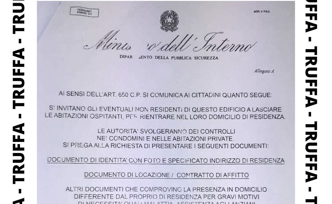 “Avvisiamo che è in circolazione una comunicazione falsa, attribuita al Ministero dell’Interno. Si tratta di una truffa”, avvisa l’amministrazione comunale di Mozzate attraverso i canali social ufficiali. L’avviso segnala la necessità per i non residenti di lasciare le abitazioni sulle quali è affisso il volantino truffa e annuncia controlli spacciati come ufficiali e autorizzati.