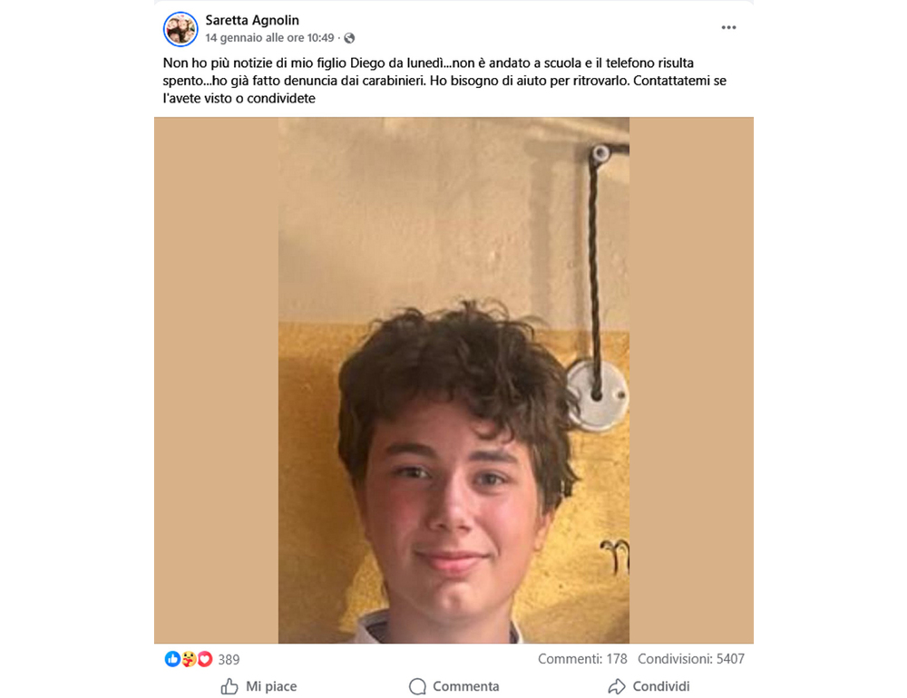 (ANSA) – VERONA, 21 GEN – E’ stato trovato a Milano, in buone condizioni, Diego Baroni, il 14enne di San Giovanni Lupatoto di cui si erano perse le tracce il 12 gennaio. Lo ha riferito il sindaco della città veronese, Attilio Gastaldello. Il ragazzo è stato scoperto dagli agenti della Polizia, e attualmente si trova negli uffici della Procura della repubblica. La madre, Sara Agnolin, è in partenza per il capoluogo lombardo. (ANSA).