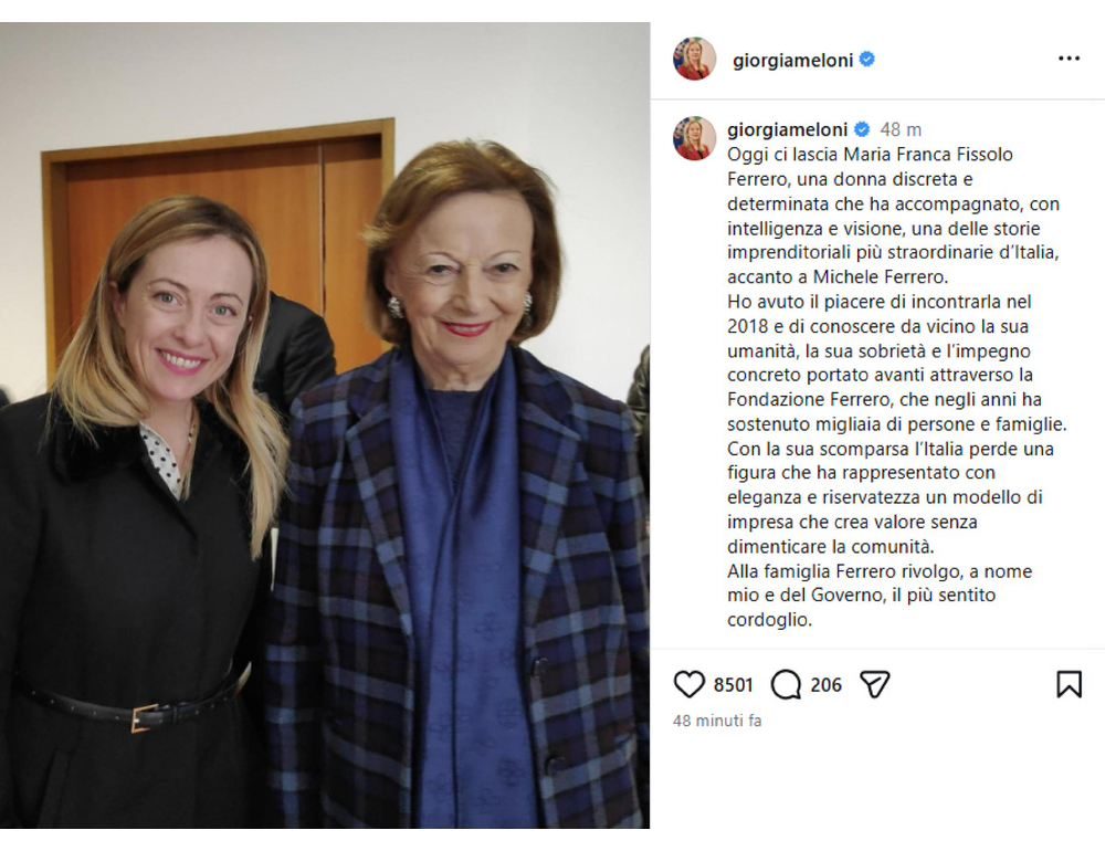 (ANSA) – ROMA, 12 FEB – "Oggi ci lascia Maria Franca Fissolo Ferrero, una donna discreta e determinata che ha accompagnato, con intelligenza e visione, una delle storie imprenditoriali più straordinarie d’Italia, accanto a Michele Ferrero. Ho avuto il piacere di incontrarla nel 2018 e di conoscere da vicino la sua umanità, la sua sobrietà e l’impegno concreto portato avanti attraverso la Fondazione Ferrero, che negli anni ha sostenuto migliaia di persone e famiglie. Con la sua scomparsa l’Italia perde una figura che ha rappresentato con eleganza e riservatezza un modello di impresa che crea valore senza dimenticare la comunità. Alla famiglia Ferrero rivolgo, a nome mio e del Governo, il più sentito cordoglio". Lo scrive su X la premier Giorgia Meloni. (ANSA).