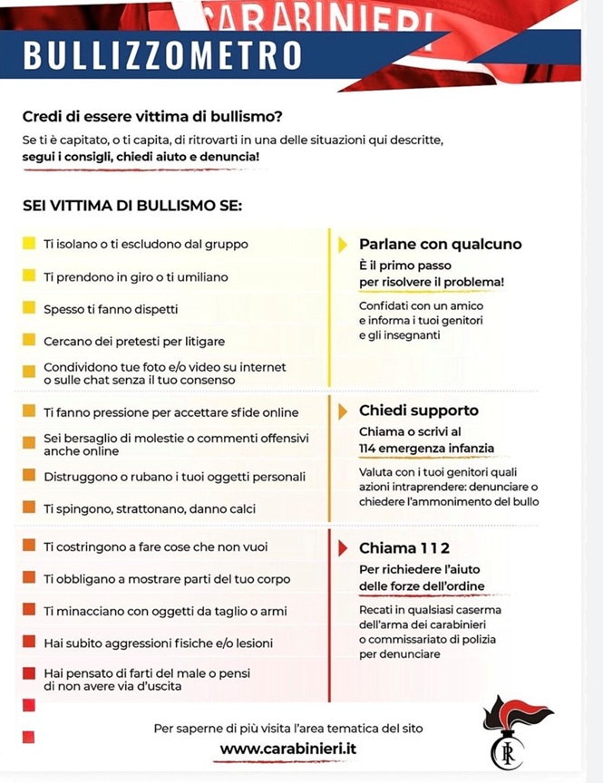 Inoltre, sono stati affrontati temi di grande attualità, come bullismo e cyberbullismo, passando per l’uso consapevole di internet e i rischi connessi, fino all’educazione alla legalità ambientale. Per l’occasione è stato presentato il “bullizzometro”, uno strumento di autovalutazione disponibile sul sito dei carabinieri. Si tratta di un test pensato per giovani, genitori e insegnanti, utile a individuare i segnali di rischio legati a comportamenti prevaricatori, sia in presenza sia online. In particolare, il questionario consente di valutare il livello di gravità delle situazioni e offre indicazioni pratiche su come comportarsi all’insorgere dei segnali premonitori, per chiedere aiuto e sostegno.
