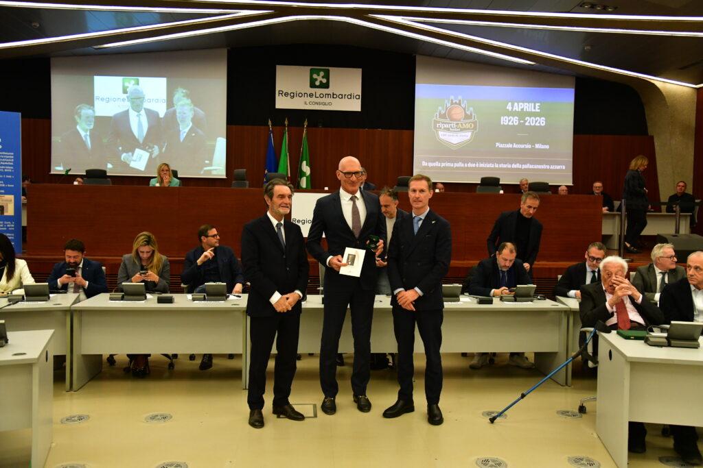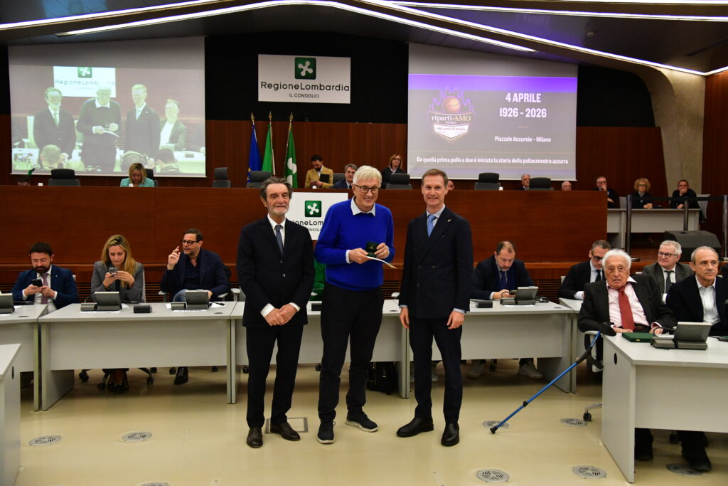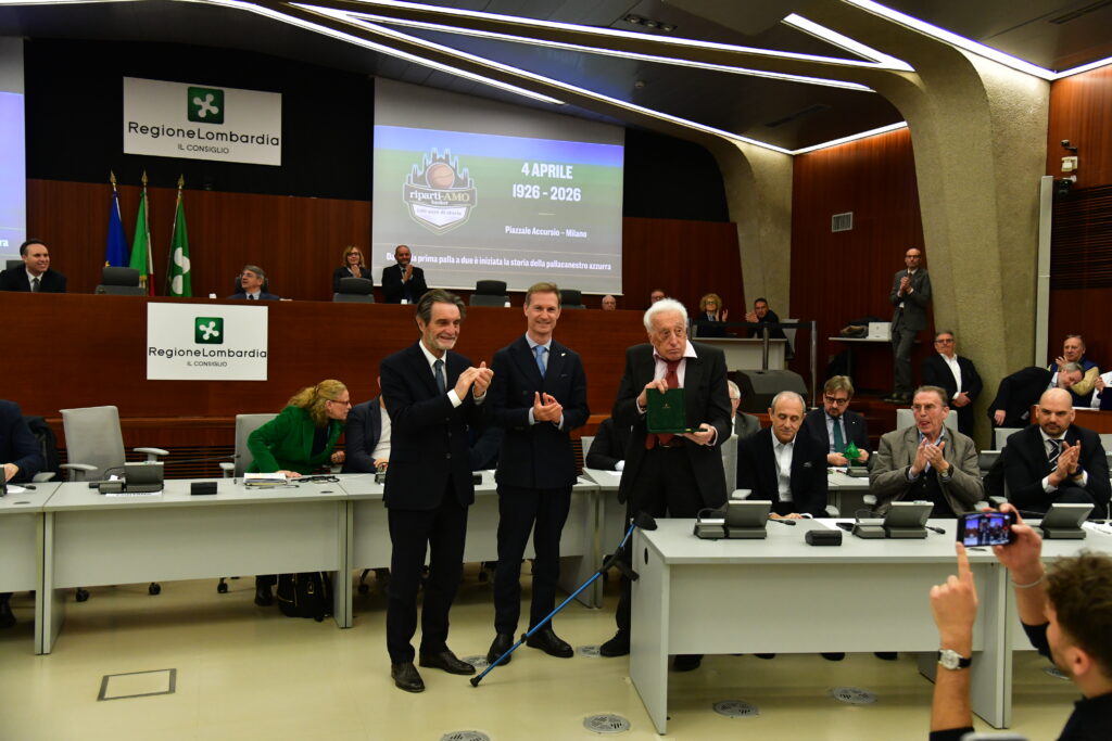 Il presidente del consiglio Federico Romani e il Governatore Attilio Fontana hanno prima di tutto consegnato un riconoscimento al simbolo della Nazionale italiana Sandro Gamba, l’allenatore più vincente della pallacanestro tricolore, classe 1932.