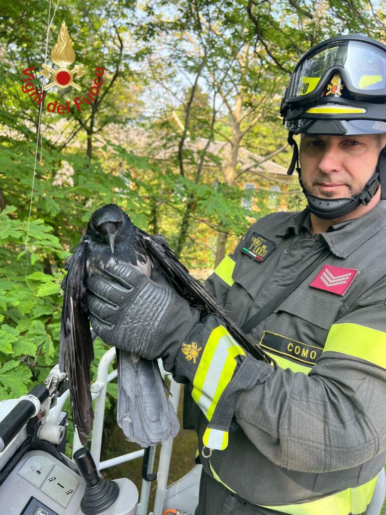 Intervento dei vigili del fuoco a Cernobbio in via Luigi Erba per il recupero di un corvo rimasto impigliato su con un cordino a un’ala, a circa 3 metri di altezza su una pianta.